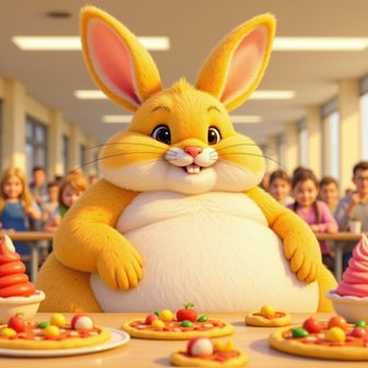 Both rabbits stock up on pizza and ice cream and take a seat. The camera films them eating while upbeat music plays. Both rabbits polish off all their food causing their bellies to swell massively once more. Finished, they sit back and relax, looking completely satisfied.
