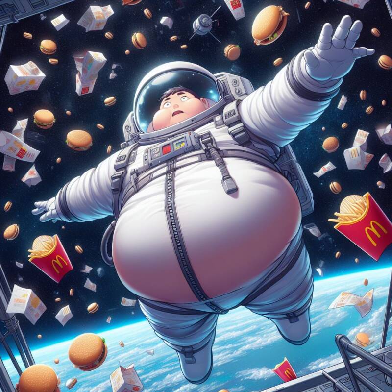 He screamed in hangry frustration and once more flew backwards, this time onto a remote latch with a red warning light on it. The light flashed behind him and the emergency door opened. His bulging ass, thirty two Big Macs, seventeen quarter pounders, ninety two nuggets, twenty six strawberry milkshakes, and a hundred and twelve portions of fries were sucked out into the vacuum of space.