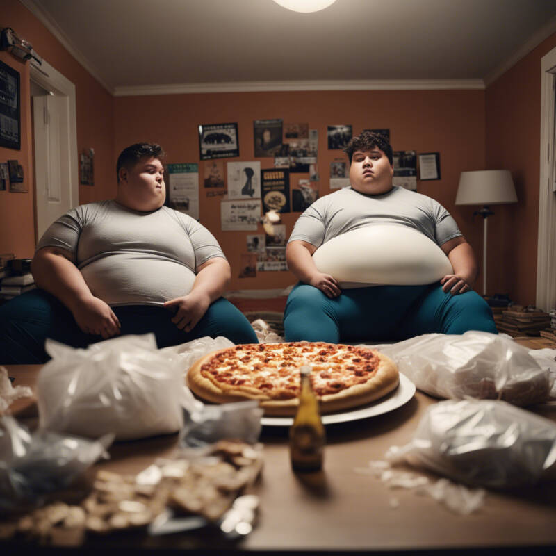 By 2 am six large empty pizza boxes littered the floor. Not a single crust was left. Max sleepily pushed twelve empty dips off his bed and both boys laid down topless on their backs in order to rest. Max’s huge glutted globe rose and fell in front of him with every heavy breath. “Man I feel replete,” he said. Stevie looked over at his happy fat friend and then down at his own wide splayed belly. Fat rolls crumpled up higher and wider than ever before he ran his fingers through his folds and began to circle one of his huge wide saucer sized nipples. With the fog of sleep and gainer brain flooding their tired neurons they both pleasured themselves until the point of exhaustive ejaculation. Too tired to clean, they fell immediately into a heavy food coma, still covered in the pleasure of their night's excess. In the room next to them the sound of Gordon munching on chips could be heard dimly through the wall.