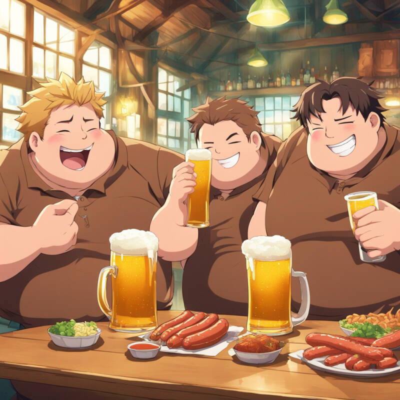 In total they spent about seven hours in the beer hall until it was clear that none of them could consume anymore. Hamburger was now leaning very much to the right despite believing that he was sat up straight and central. His sense of balance long since lost to the enormous amount of alcohol that he consumed on a daily basis. This rightward lean caused a long tall strip of side belly fat to hang out of his shirt which had long since untucked itself and now rode pridefully high above his expansive belly like a great leader astride a magnificent horse. Wiener Schnitzel, sitting opposite, kept a keen eye on this thick strip of friendly fat. Pierre recognised this look of longing in his now misty eyes. Wiener Schnitzel was slumped back against a post. His fat face sunk low back into his shoulders causing his fat neck to disappear behind his chins. His now massively bloated belly was pushed forward and out from underneath his dark shirt. His fat right hand digging into his exposed underbelly, he undid his top button and fly and sank his hand deep into his underwear, at first raising it to release himself of the pain of the elasticated waistband, before sighing and leaving his hand very clearly holding his now expanded knackwurst in what some call ‘the comfort position.’
